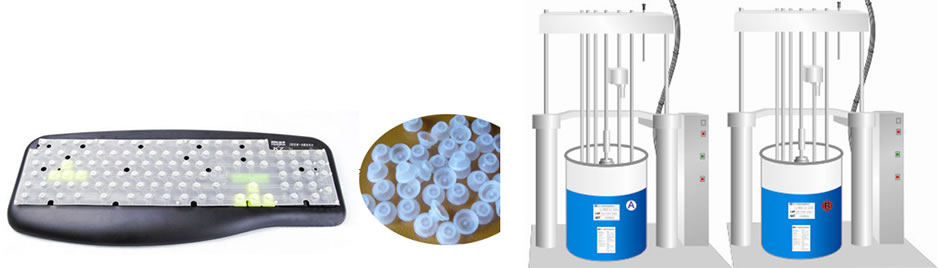スタティック ミキサーを使用しA と B を1:1 の割合で 2 つの成分を混ぜ合わせます。混合物を射出成形機に直接流し入れます。AB 混合物は、数秒で加硫することができます。